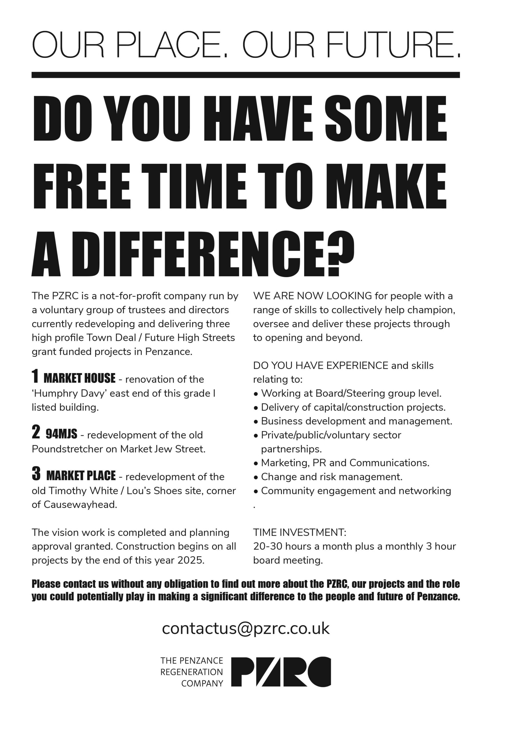 The PZRC is a not-for-profit company run by a voluntary group of trustees and directors currently redeveloping and delivering three high profile Town Deal / Future High Streets grant funded projects in Penzance.